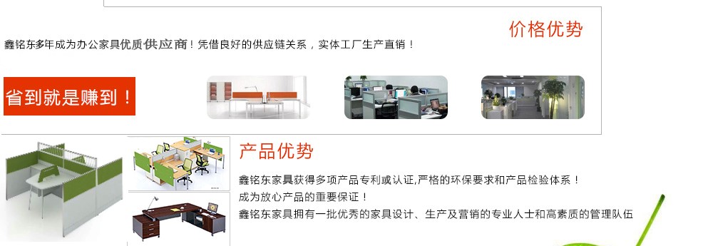 深圳市鑫銘東家具有限公司深圳市鑫銘東家具有限公司專業(yè)銷售各類辦公家具!產(chǎn)品涉及多種系列,如:班臺、班椅、屏風(fēng)、會議桌、會議椅、辦公沙發(fā)、茶幾、辦公桌、文件柜、電腦桌椅、各式餐臺、餐椅、書柜等辦公家具。 鑫銘東家具擁有一批優(yōu)秀的家具設(shè)計、生產(chǎn)及營銷的專業(yè)人士和高素質(zhì)的管理隊伍。銘東家具以"先難后易"之戰(zhàn)略,在產(chǎn)品結(jié)構(gòu)、產(chǎn)品質(zhì)量及服務(wù)水平方面,均推陳出新,力求完善,精益求精。使我們的產(chǎn)品質(zhì)量保持在國內(nèi)外家具潮流的先進水平,力求滿足客戶的特殊需求。鑫銘東家具多年來致力于環(huán)保、實用家具的設(shè)計與開發(fā),集生產(chǎn)、銷售、服務(wù)于一體。本著"以人為本"的設(shè)計理念,大量開發(fā)符合人體工程學(xué)的各種產(chǎn)品,以"誠信為本"的質(zhì)量方針,真材實料,認(rèn)認(rèn)真真做產(chǎn)品,實實在在做人。鑫銘東家具更致力于創(chuàng)造"零維修率"的制造境界,實現(xiàn)"沒有維修的服務(wù)才是最好服務(wù)"的口號》了解更多 |
